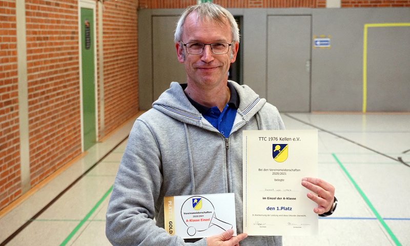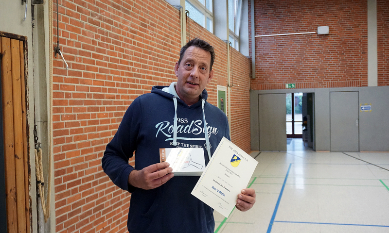 Dafür bedankte sich Geschäftsführer Klaus Verburg mit Worten des Dankes, einem Präsent und obendrein bei Detlef van Uffelt mit der Ehrennadel des Westdeutschen Tischtennis-Verbandes in Gold. Diese hatte Werner Aben schon vor 10 Jahren erhalten.